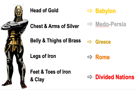 The interpretation, given by God through the prophet Daniel is illustrated in the diagram. The metals stood for the succession of powerful empires that would particularly affect the history and destiny of Israel. History testifies to the uncanny accuracy of this prophecy.
